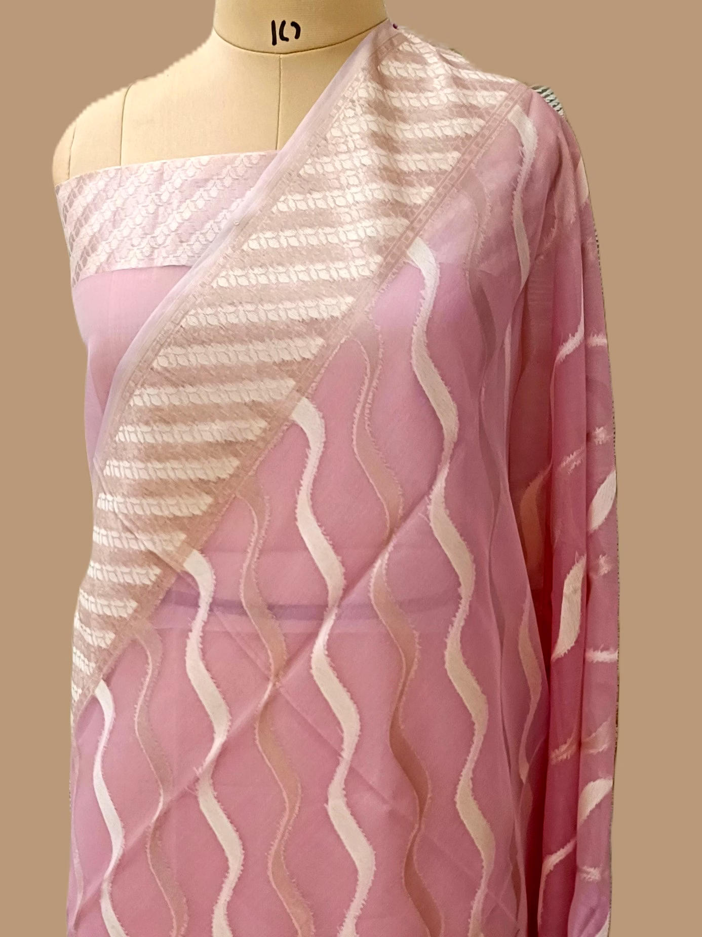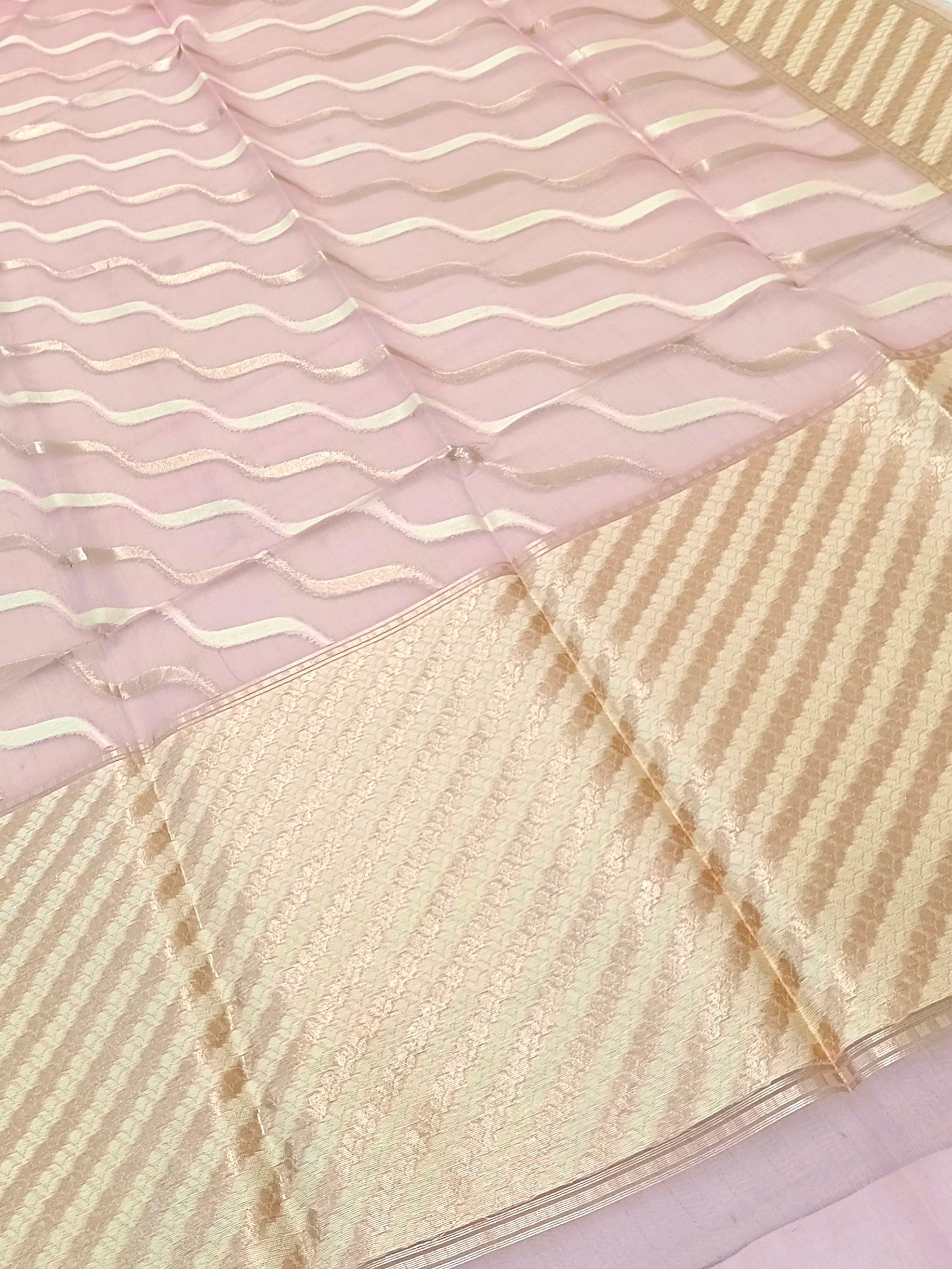 Indulge in the timeless beauty of our Baby Pink Kora Saree, meticulously crafted with delicate Resham and Zari work. Each intricate detail adds a touch of sophistication and grace, making it a must-have for special occasions.