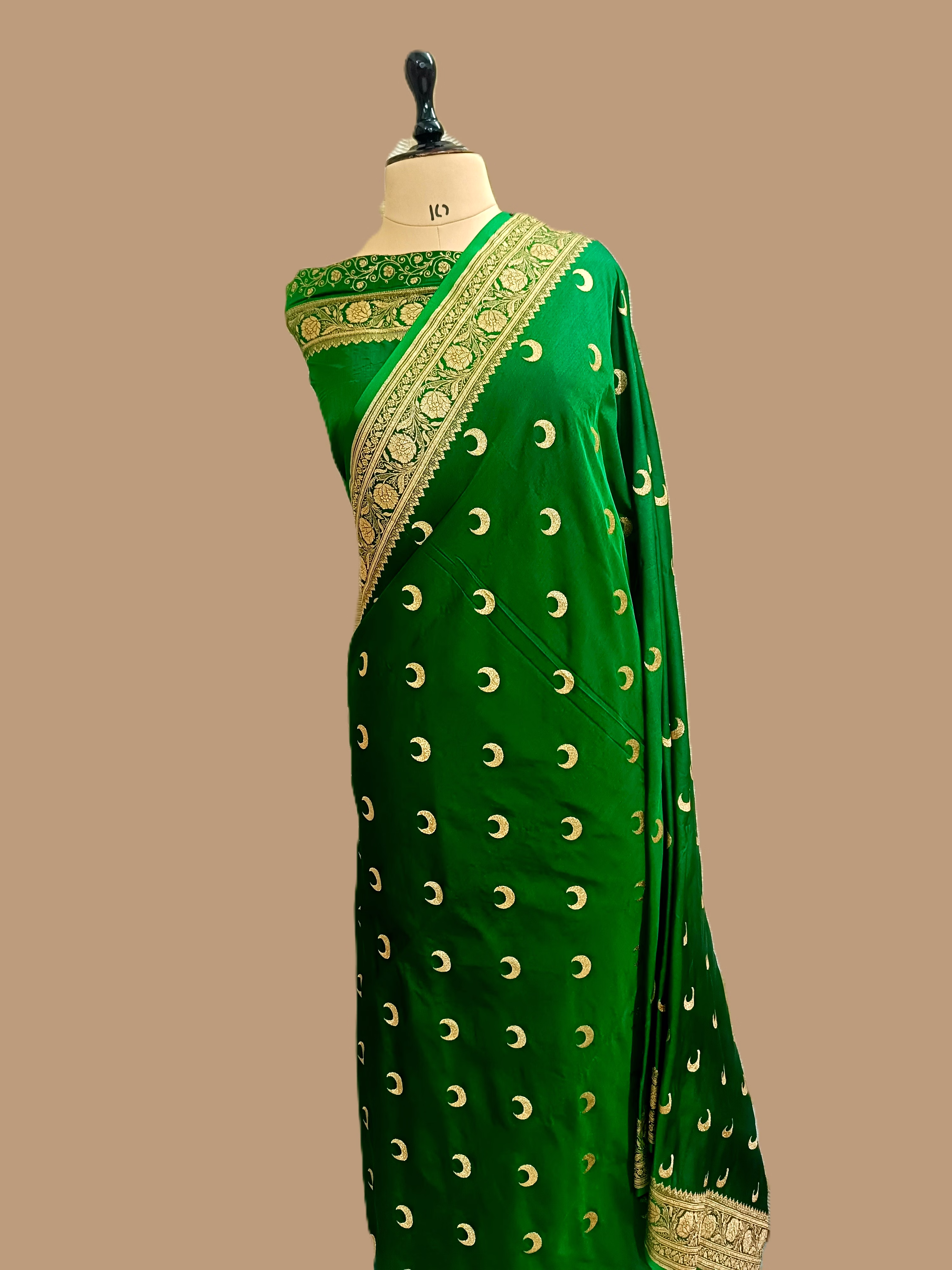Indulge in the luxurious feel of our Bottle Green Katan Silk Banarasi Saree. Handwoven to perfection, every detail exudes timeless elegance, making it a must-have for any wardrobe.