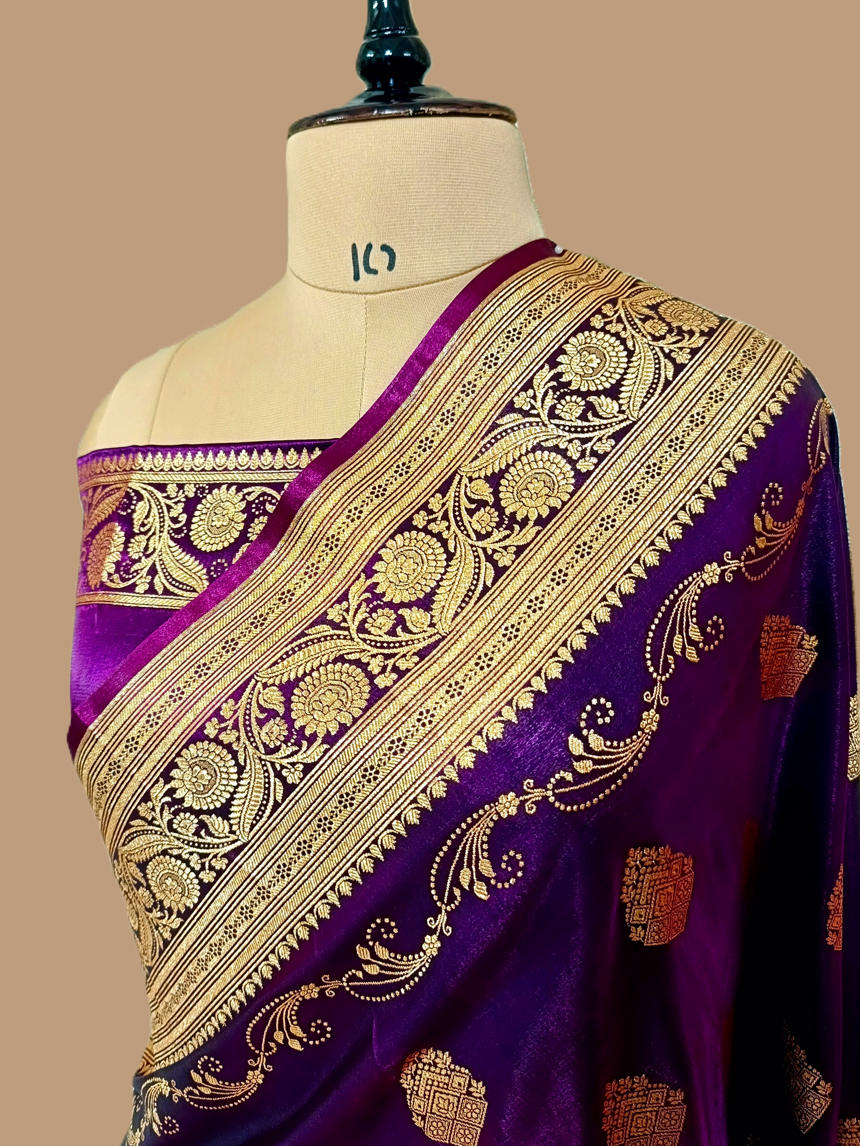 Drape yourself in luxury with our Exquisite Magenta Nylon Satin Silk Banarasi Saree. Handcrafted with meticulous attention to detail, this saree showcases intricate weaving techniques that make it a true masterpiece.