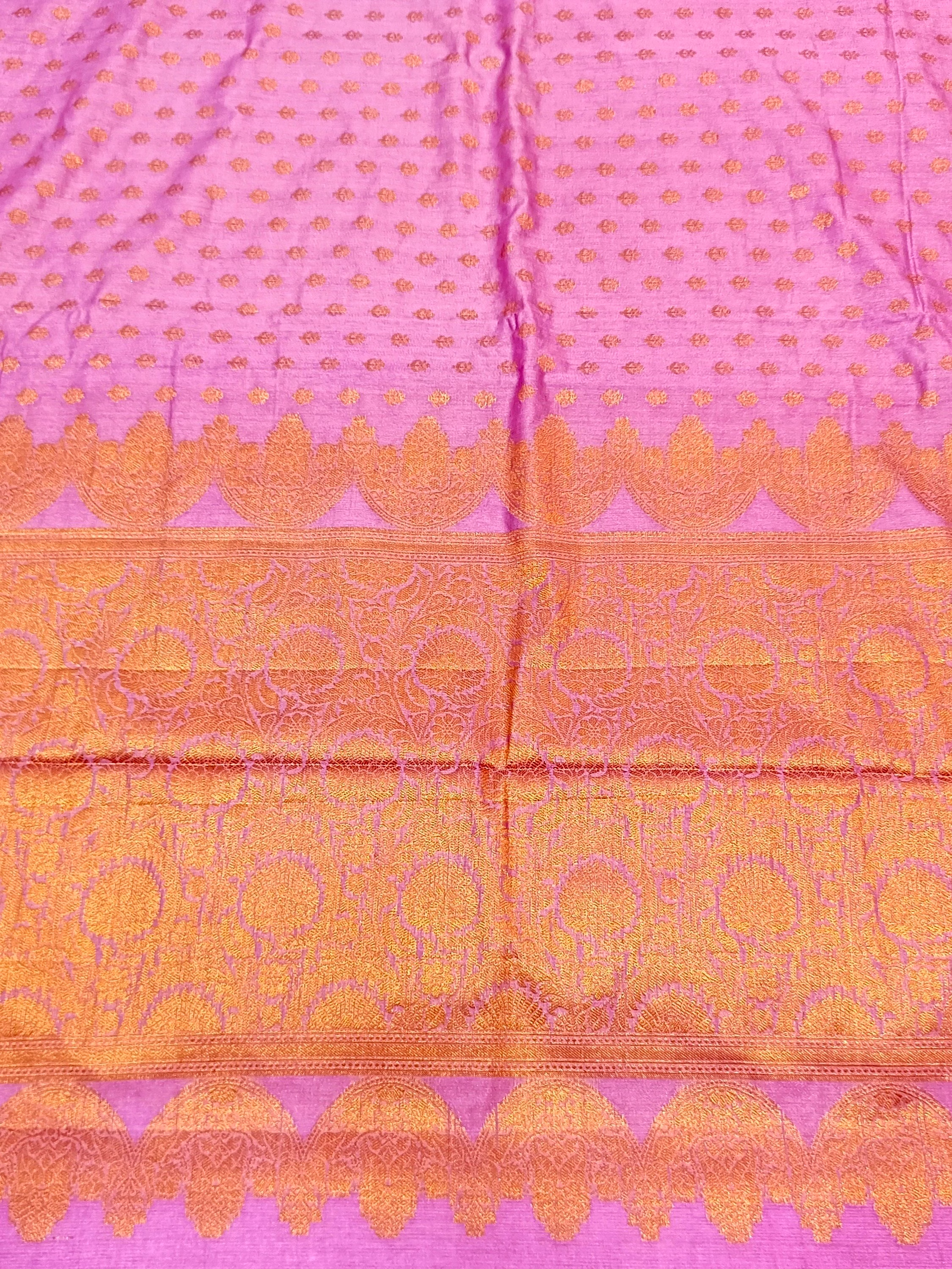 The Copper Zari Brocade Blouse complements the saree perfectly, adding a touch of regal charm. Each thread woven with care to create a masterpiece that blends tradition with contemporary fashion.