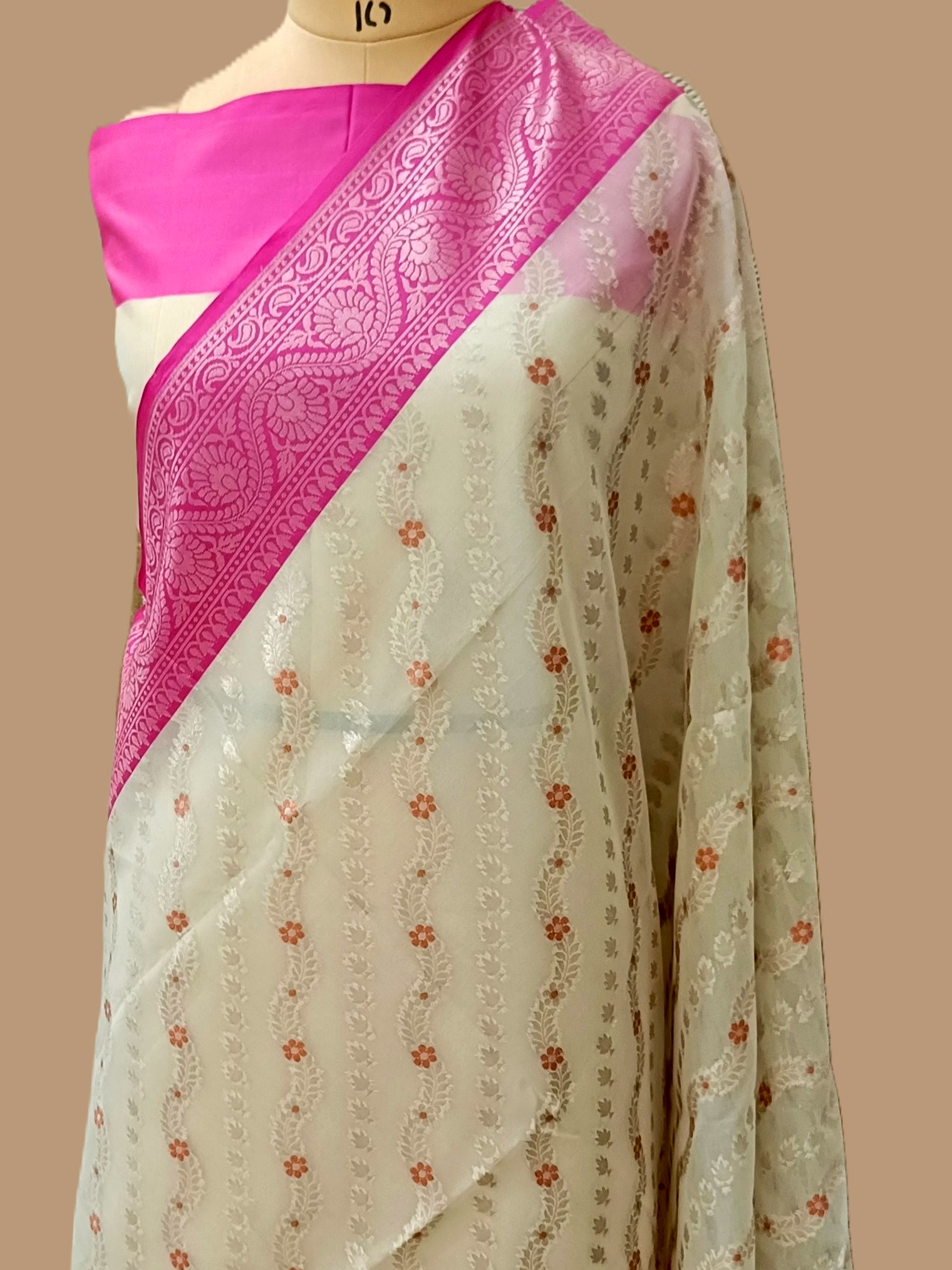 Make a statement of elegance with our White Kora Saree that effortlessly transitions from daytime chic to evening glamour. Whether it's a festive celebration or a formal gathering, this saree elevates your style quotient, turning heads wherever you go.