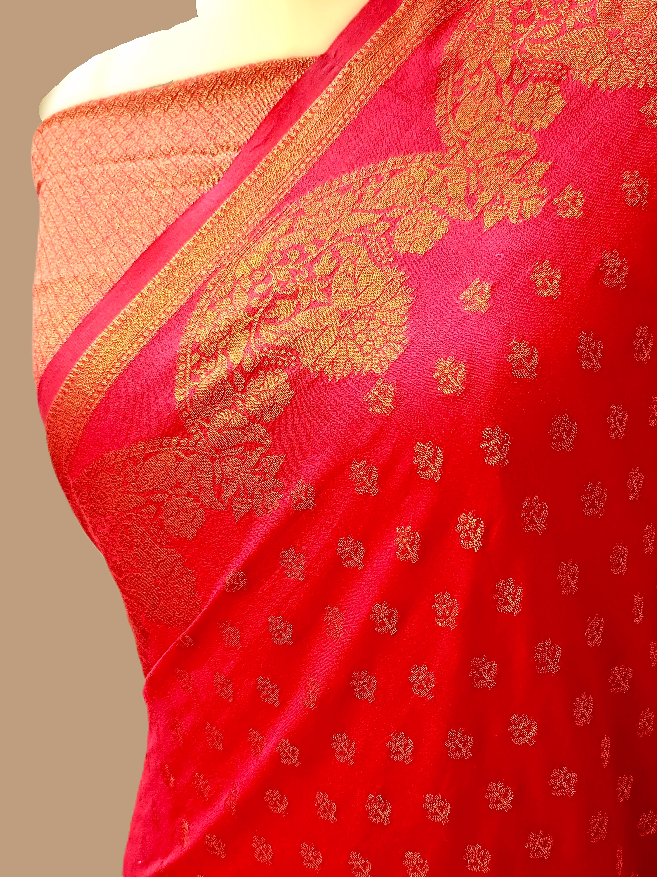 The versatile design of this saree, paired with a captivating Copper Zari Brocade blouse, effortlessly blends traditional charm with contemporary fashion, ensuring you stand out with sophistication.