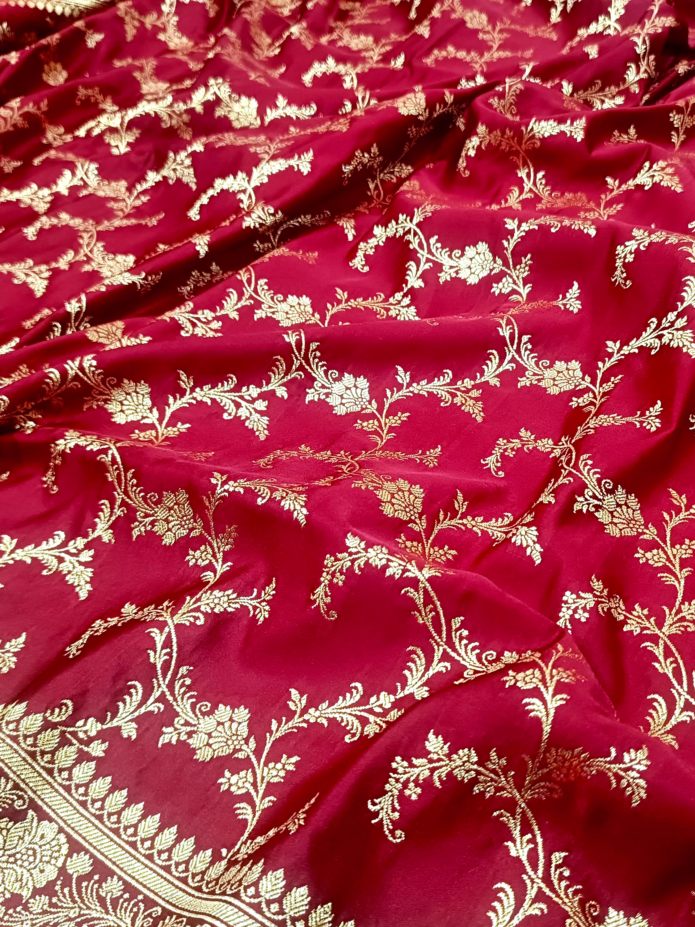Elevate your ethnic wardrobe with our exquisite Maroon Katan Silk Saree Banarasi Jaal. Crafted with precision and tradition, this saree exudes elegance and grace.
