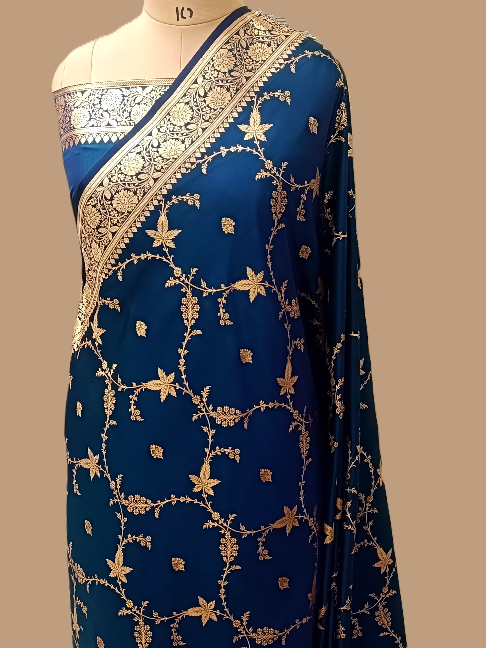 Experience the luxurious feel of pure Katan Silk draped in a mesmerizing Navy Blue hue. This saree exudes opulence and sophistication, adding a touch of royalty to your ensemble.