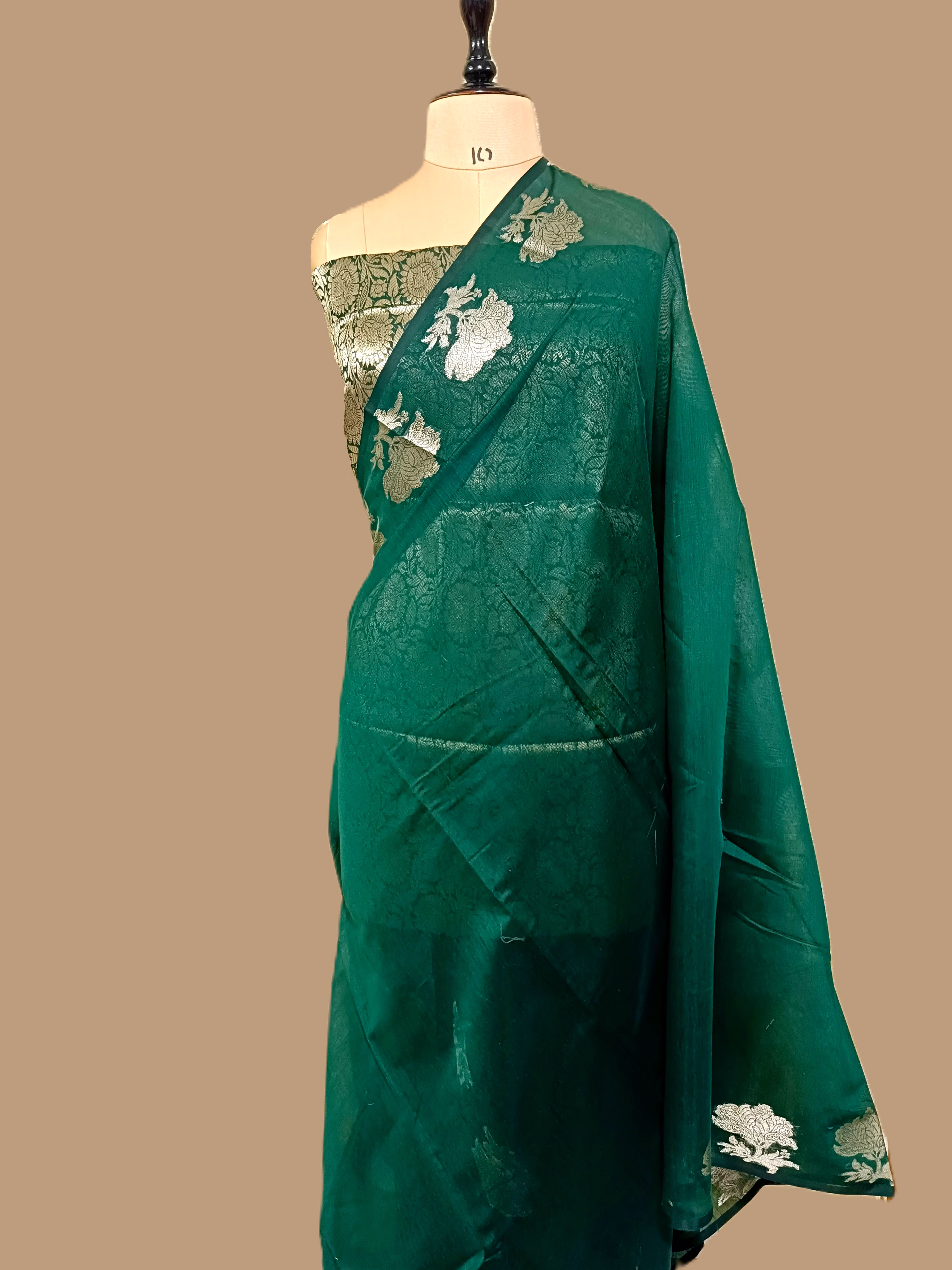 Experience the allure of timeless elegance with the Rama Plain Cotton Silk Banarasi Saree. From the vibrant color palette to the intricate details, this saree captures the essence of Indian tradition with a modern flair, ensuring you stand out with grace and poise.