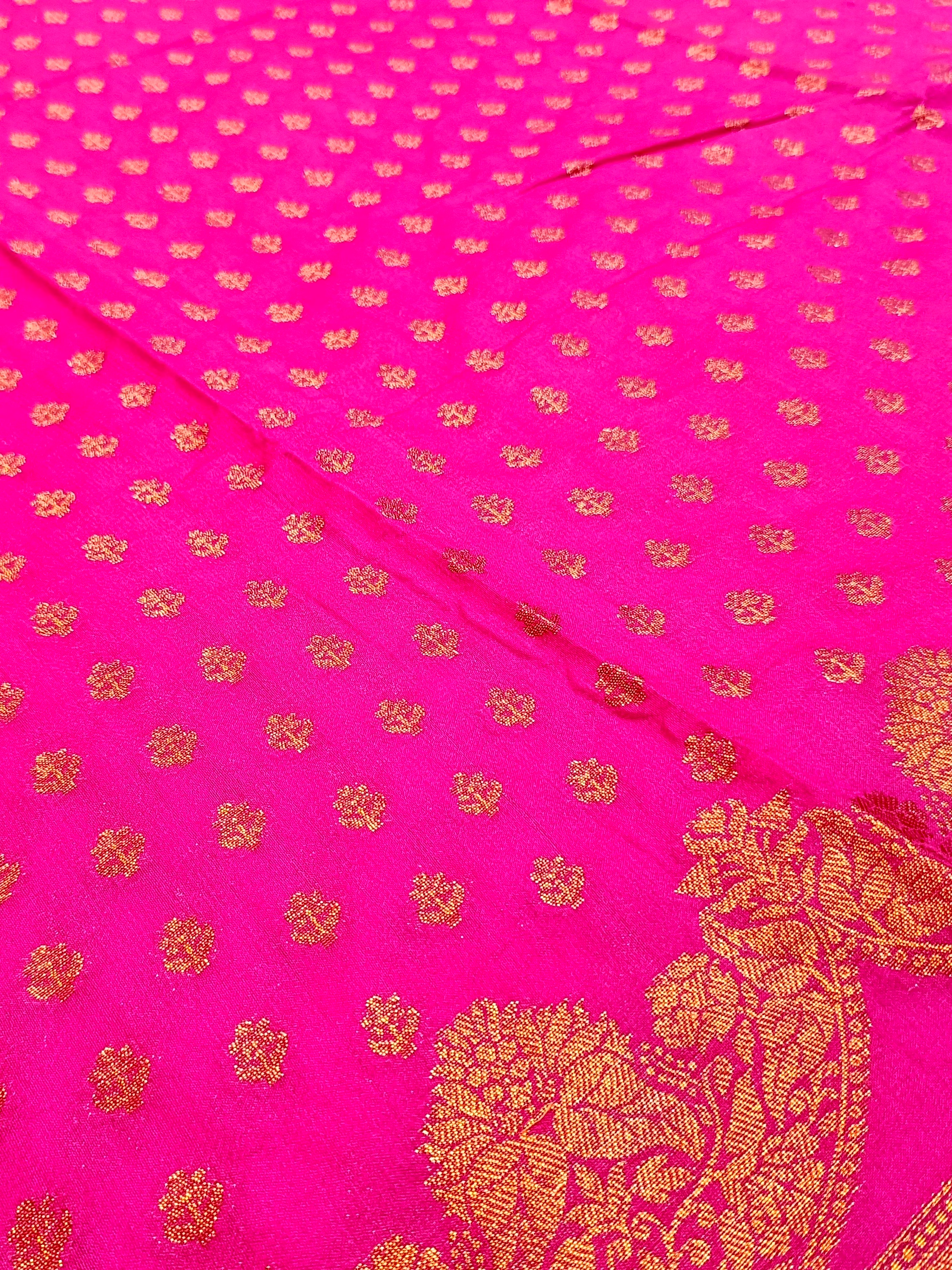 Indulge in the artistry of traditional Indian weaving with this finely crafted Rani Georgette Silk Saree and its intricate Copper Zari Brocade Blouse. Each thread tells a story of heritage and beauty.