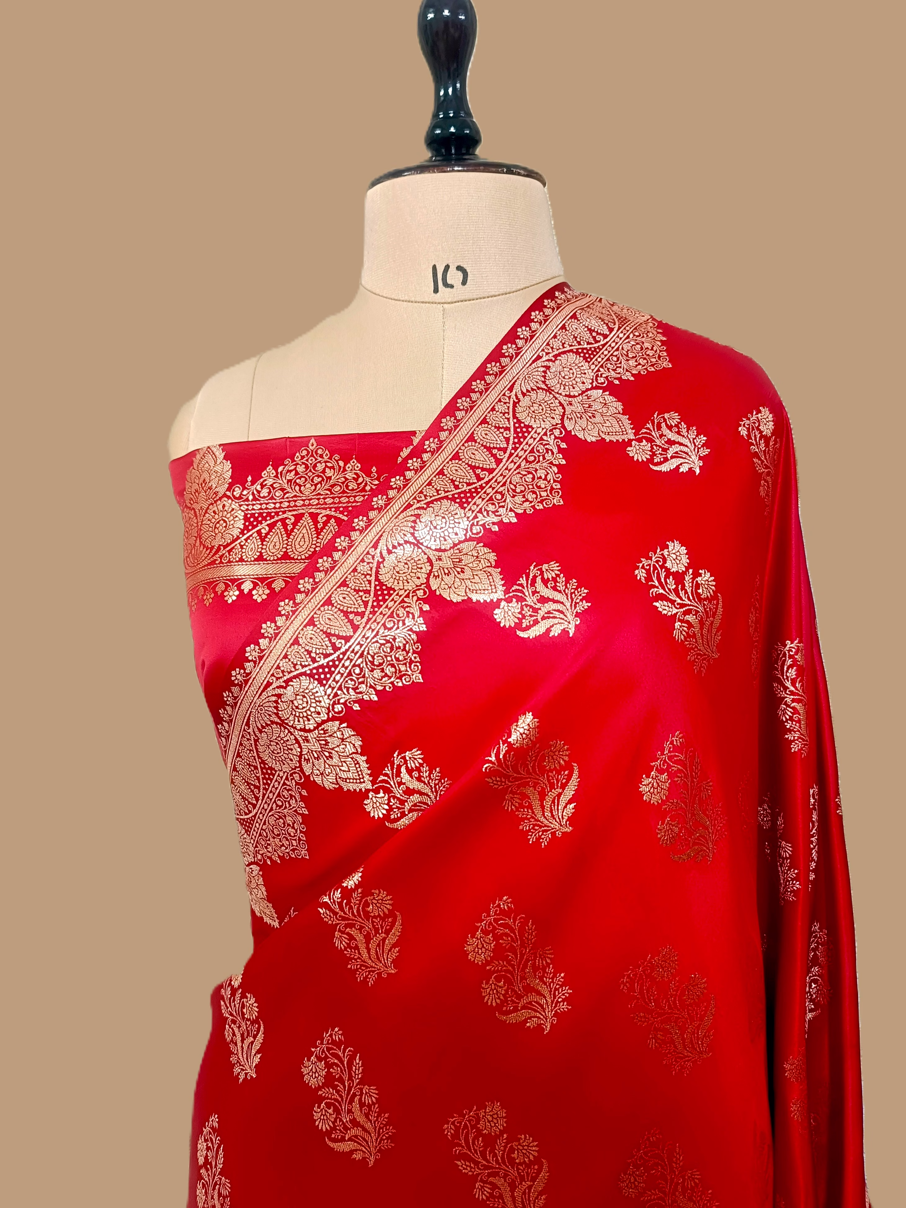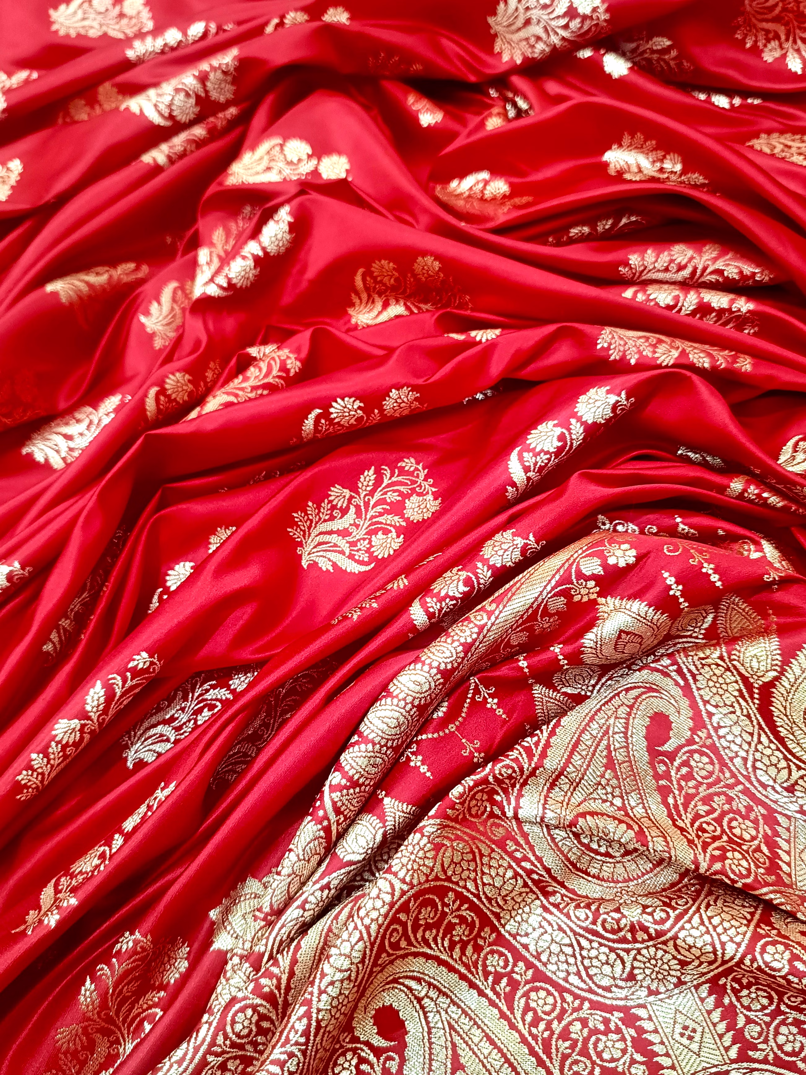 Embrace the rich heritage of Banarasi weaving with each drape of the Red Katan Silk Saree, a fusion of traditional craftsmanship and modern style.