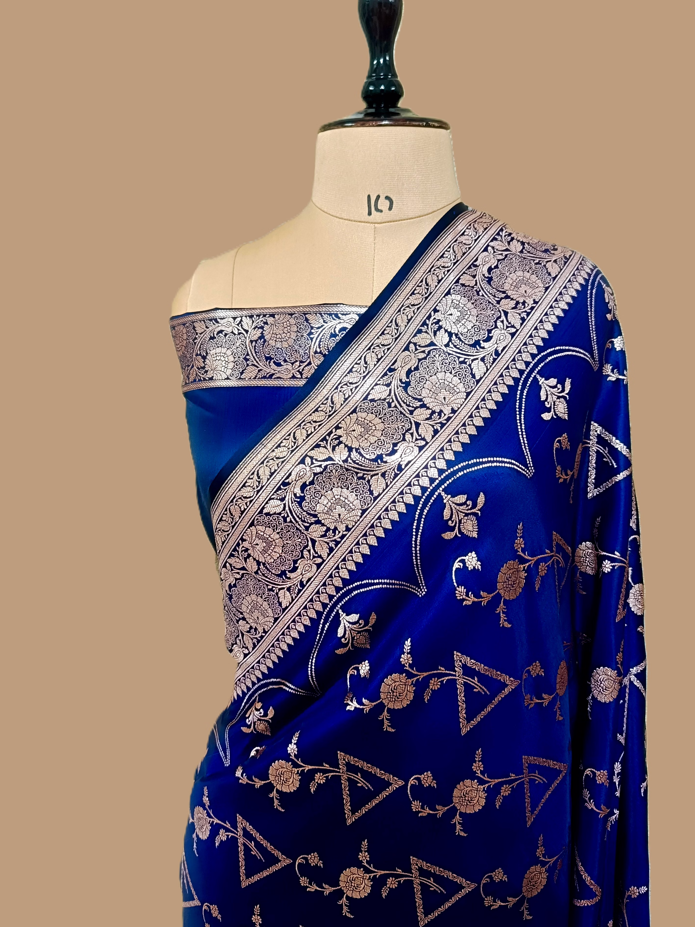 Indulge in the exquisite craftsmanship of our Royal Blue Katan Silk Banarasi Saree, intricately woven with Banarasi artistry that tells a story of heritage and luxury. Each thread, a testament to skilled artisans dedicated to creating a masterpiece.